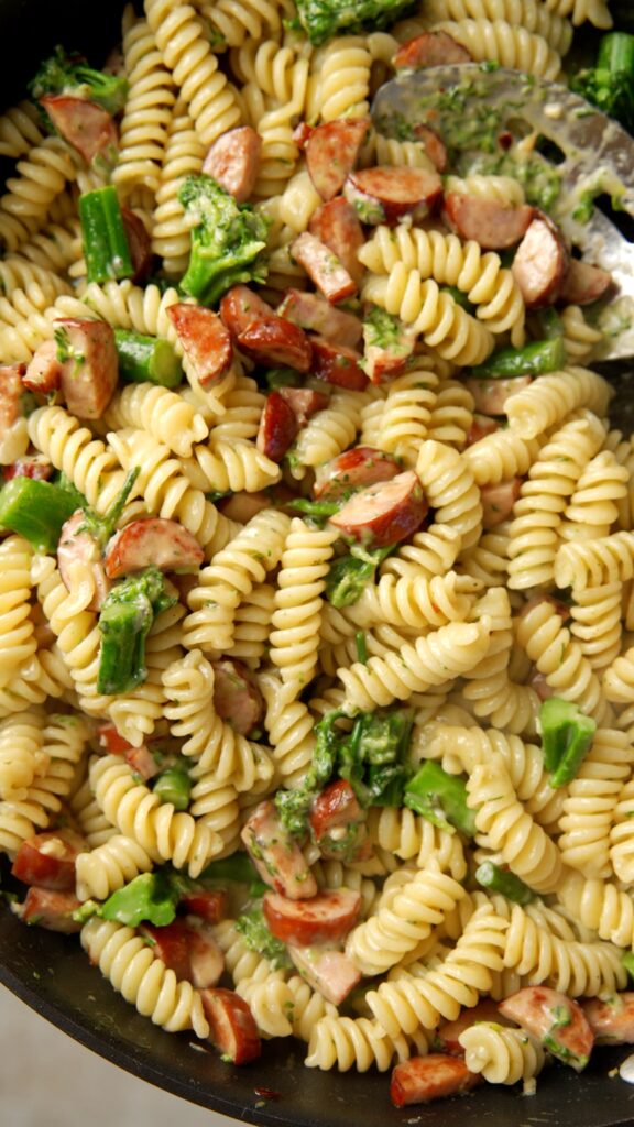 In a large skillet over medium heat, add 1 tablespoon of olive oil and cook the chopped sausage (Greenridge Black Forest Sausage- click here to buy), until browned and crispy on all sides, about 4-5 minutes.