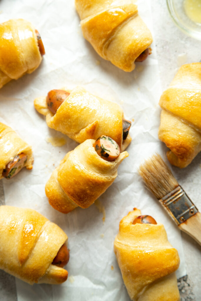 Roll the dough tightly around the sausage, tucking in the ends to seal in the filling. Repeat with the remaining dough triangles and sausages.