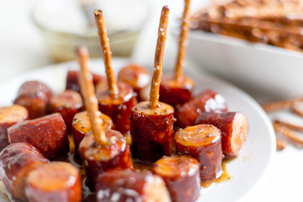 Once the sausages are fully cooked, remove them from the oven and allow them to cool for a few minutes. Then, insert a pretzel stick into each sausage piece. This will create an edible toothpick that is perfect for snacking.