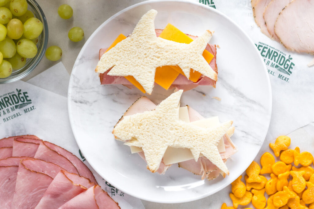 This delicious and playful meal is made with premium Greenridge Farm ingredients, including savory Caminito Ham and Sharp Cheddar Cheese, as well as Garden Herb Turkey and classic Swiss Cheese. With each bite, you'll experience a flavor adventure that's as exciting as it is delicious! Using a shark-shaped cookie cutter, you can create a fun and fin-tastic sandwich that's perfect for any ocean-loving foodie. So, get ready to sink your teeth into this jaw-dropping sandwich and enjoy the taste of the sea!