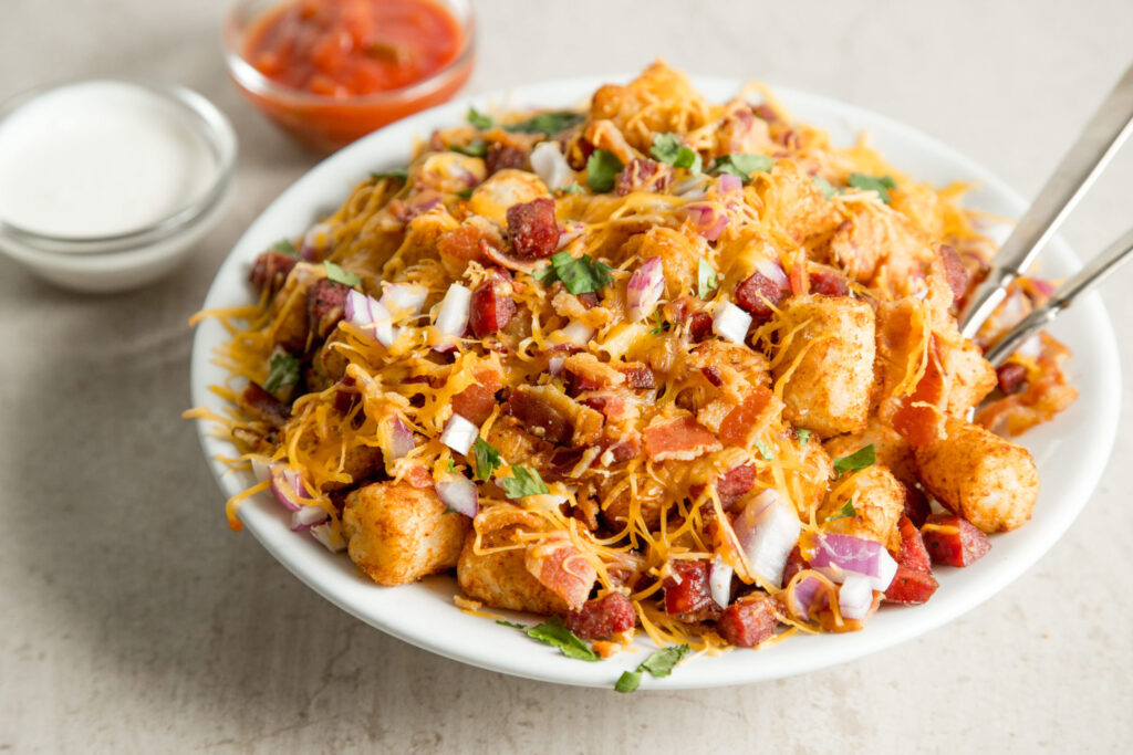 Indulge in a playful twist on a classic with our Tater Tot Nachos—a culinary delight that reimagines nachos with the smoky charm of Applewood smoked bacon and the irresistible melt of cheddar cheese. This dish is a symphony of comfort and flavor, where crispy tater tots become the canvas for a delectable combination of ingredients. With each bite, the savory allure of bacon meets the creamy goodness of melted cheddar, creating a taste experience that's both indulgent and satisfying. Crafted with care, Tater Tot Nachos invite you to enjoy a fun and flavorful creation that's perfect for sharing and relishing moments of culinary joy.