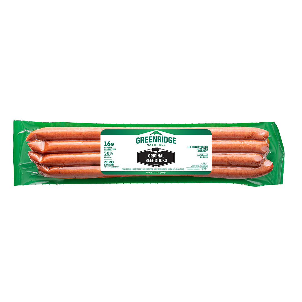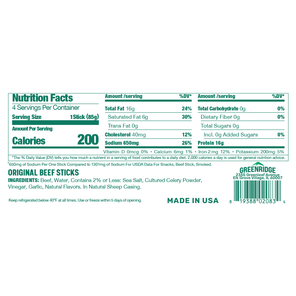 Greenridge Beef Snack Sticks pack 16 grams of protein in every stick, making it a great keto-friendly and high-protein snack-on-the-go. Our All-Natural Beef Sticks contain ONLY natural ingredients you can read: beef, water, sea salt, celery powder, vinegar, garlic, and natural flavors, with no added Nitrates, Nitrites, or phosphates.