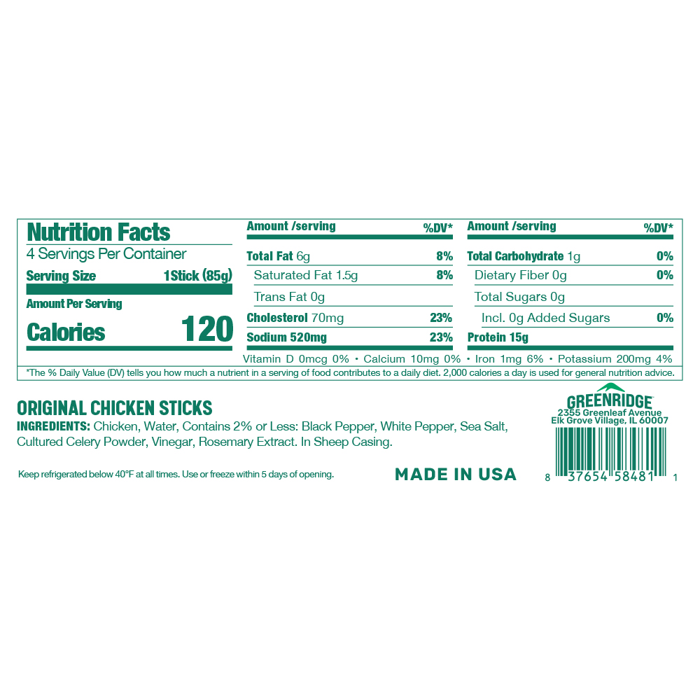 Greenridge Original Chicken Sticks are a healthy on-the-go snack contain 15 grams of protein in every stick, and only contain ingredients you can read: chicken, water, black pepper, white pepper, sea salt, celery powder, vinegar, rosemary, with a natural sheep casing. Fully cooked, these snack sticks are free of MSG, Soy, Gluten, artificial colors and flavors and have no added nitrates, nitrites, or phosphates.