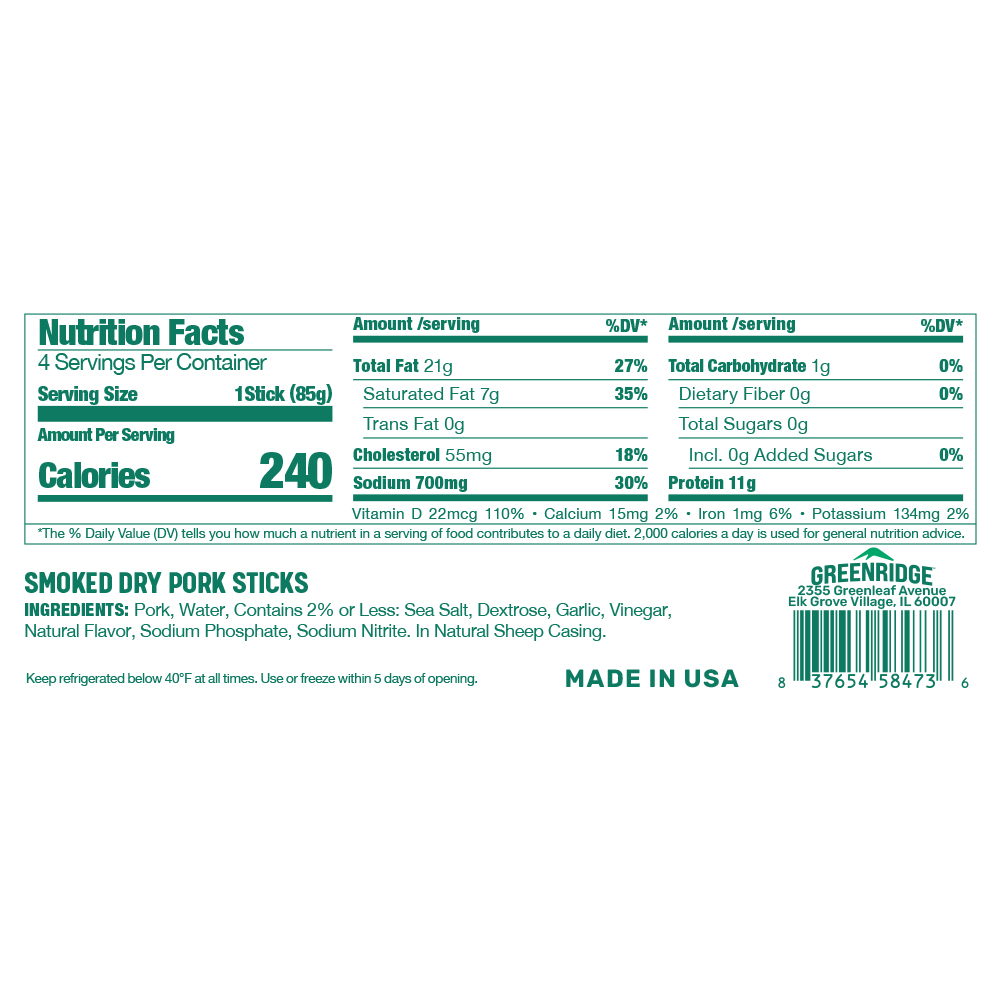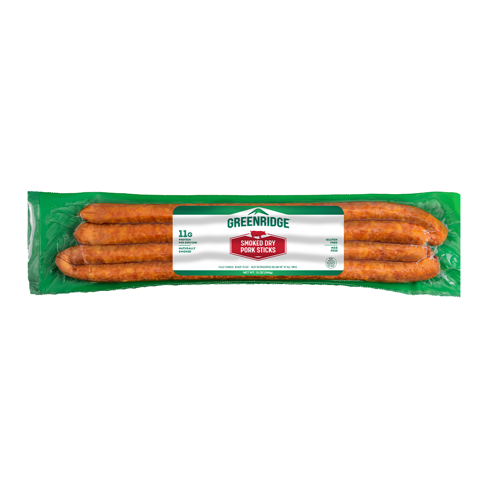 Greenridge Smoked Dry Pork Sticks, known in Poland as kabanos, are a very popular snack food originating from Poland, also referred to as cabanossi or kabanas. Greenridge Smoked Pork Sticks offer a unique flavor profile, with a slightly smoky and savory taste that many people find delicious. As a dry-smoked sausage, Kabanos is a perfect keto-friendly snack for those always on the go. Made from 100% pork and with no added preservatives or artificial ingredients, our Kabanos are a healthy snack option for those looking for a protein-rich snack. Enjoy this delicious snack on its own, added to charcuterie boards, or as a healthy snack in school lunches.