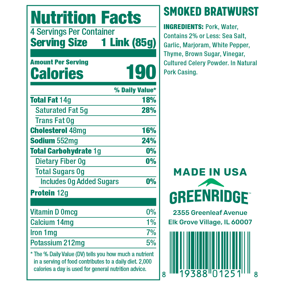 No liquid smoke here! We take pride in smoking our bratwursts in house, the natural way until fully cooked throughout.. Our Smoked Brats deliver some hefty protein with a just a hint of garlic and brown sugar. Perfect for tailgating or grilling season!